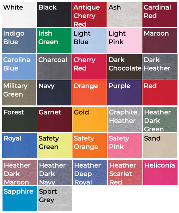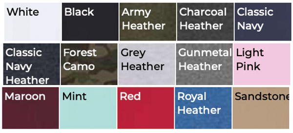 - All other Heather colors are 55/45 cotton/polyester (Charcoal Heather, Classic Navy Heather, Royal Heather, Army Heather)